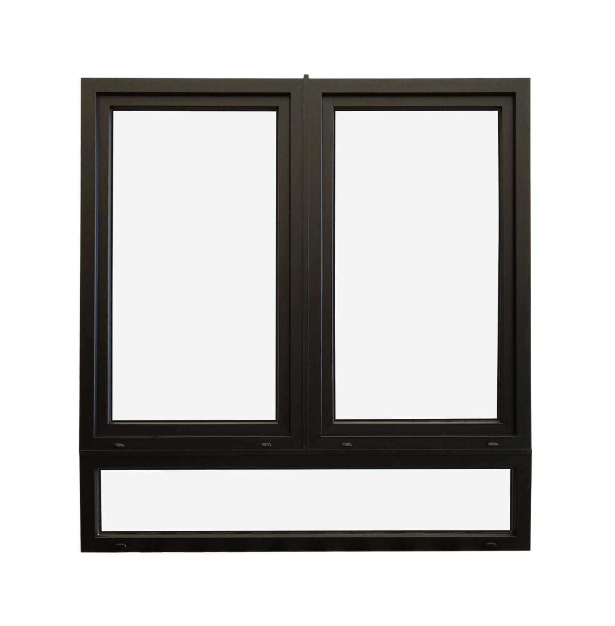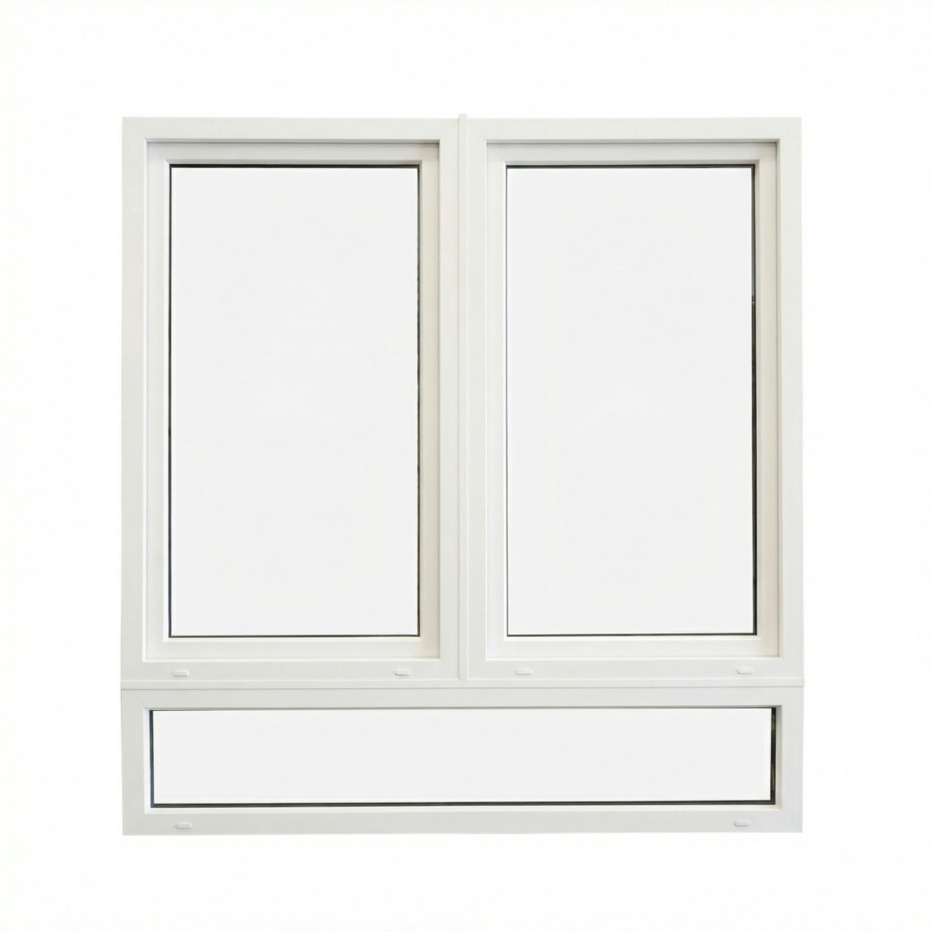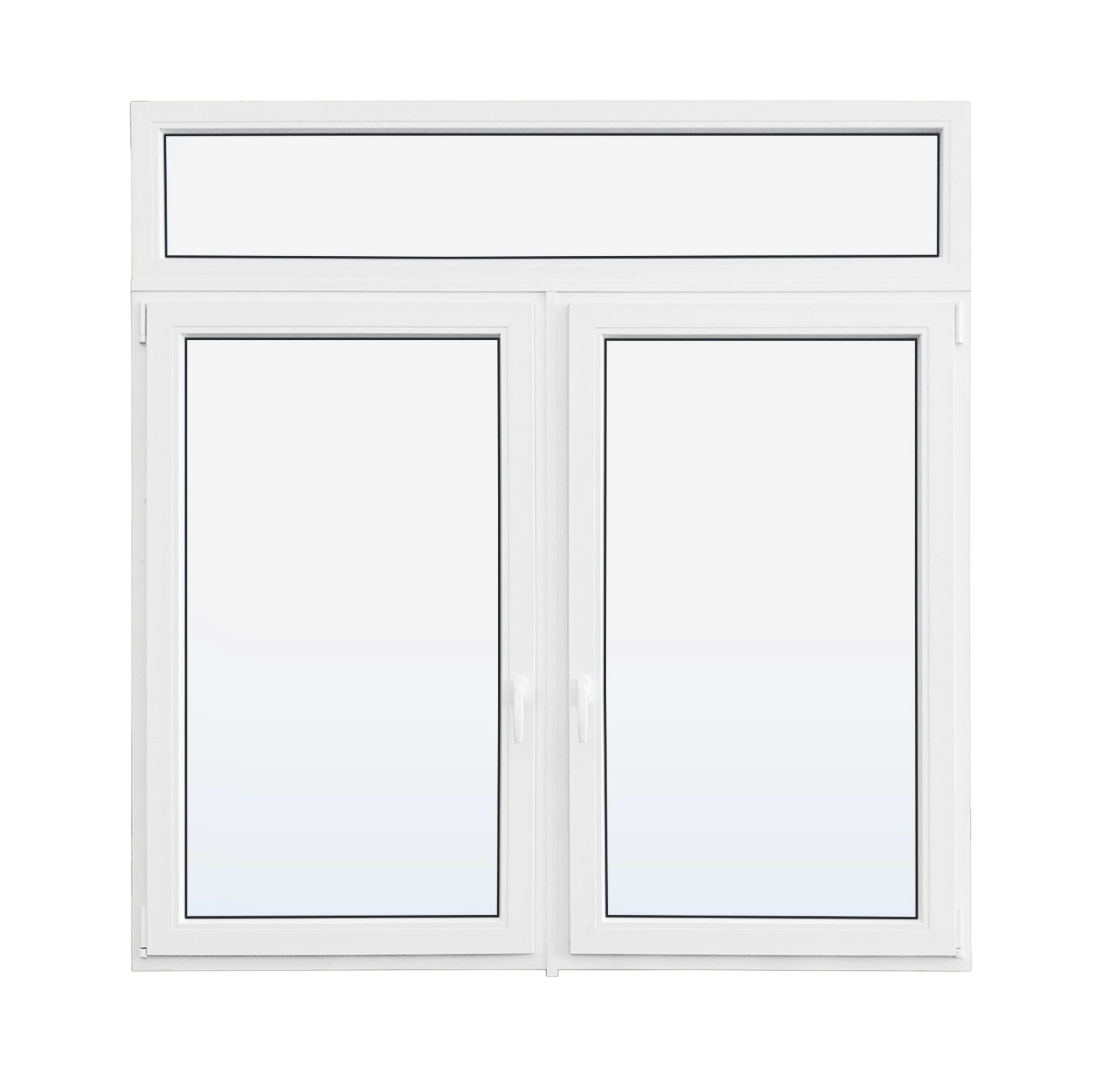 A double sash window with transom combines two operable tilt-and-turn sashes with one fixed window. In the tilt position, the top of the sash pivots inward. In the turn position, the sash opens inward on side hinges, allowing full access. The fixed unit may be positioned above, below, or within the overall configuration, providing flexible layout options. Mosquito screen is included for the tilt-and-turn sashes.